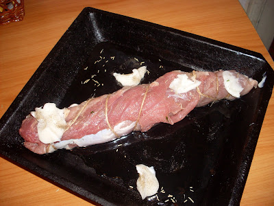 Azi mi-am adus aminte ca mai am in congelator un muschiulet de porc pe care l-am cumparat datorita unei colege care se tot lauda ca face niste snitele super tari din el . Pana la urma eu am facut snitele tot din piept de pui iar asta a ramas in comgelator iar azi i-a venit randul :) Si m-am gandit sa-l fac mai special asa cum doar de Craciun obisnuiesc. Am fost si am cumparat o bucata de carnat mai subtire si de calitate si m-am apucat de treaba.