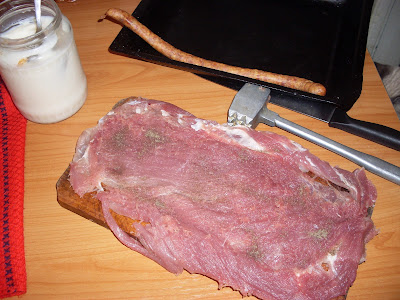 Am taiat carnea (nu de tot) ca sa fie o felie mai subtire si mare apoi am batut-o usor cu ciocanul de carne , am pus sare si piper.